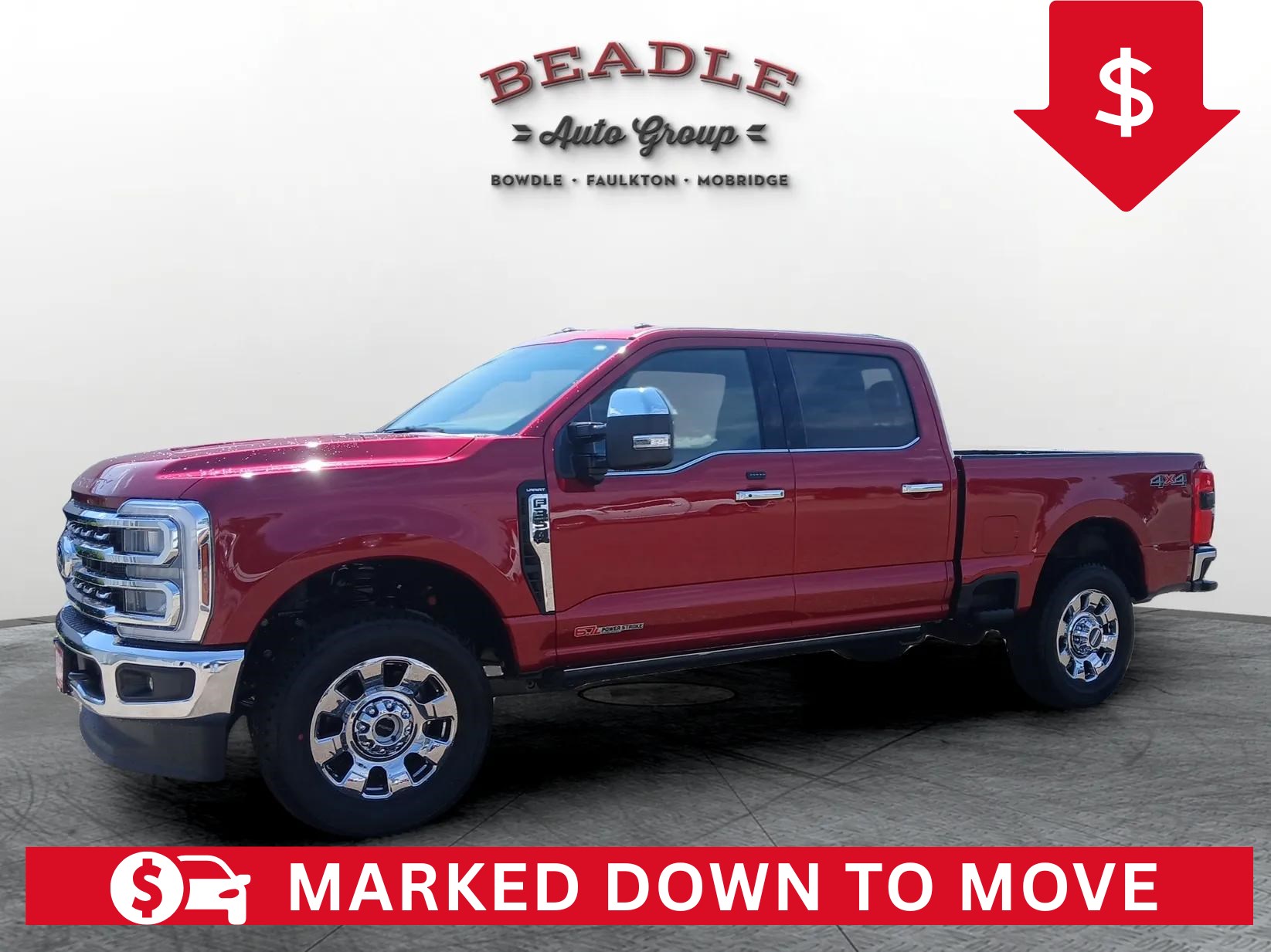Built for those who demand the ultimate in power and refinement, this 2025 Ford F-350 Lariat Crew Cab 4x4 is now available at Beadle Ford & Chrysler Center in Bowdle, South Dakota. Featuring the incredible 6.7L High Output Power Stroke® Turbo Diesel V8 and a 10-speed TorqShift® automatic transmission, this Super Duty truck delivers massive towing capacity, advanced technology, and superior comfort. Finished in Ruby Red Metallic with a luxurious Baja ActiveX™ interior, it’s as stylish as it is capable.